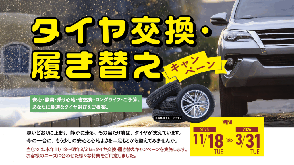 当店では、本年11/18〜明年3/31までタイヤ交換・履き替えキャンペーンを実施します。